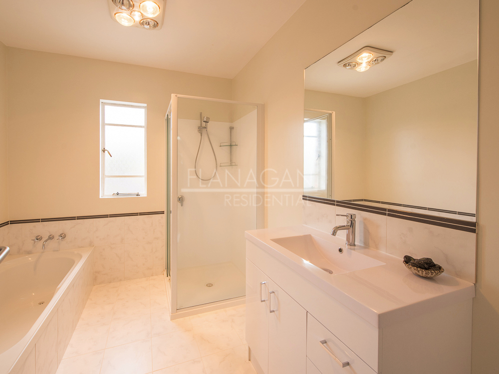 The bathroom is a perfect size featuring a bath and separate shower.