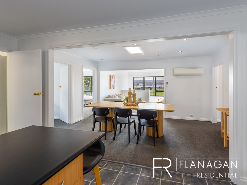 The impressive open plan living room at the front of the house is sunlit and has beautiful views across Windsor Park to the Tamar River and mountains beyond. This area flows into the adjoining dining and kitchen area, making it an ideal central hub to entertain family and friends.